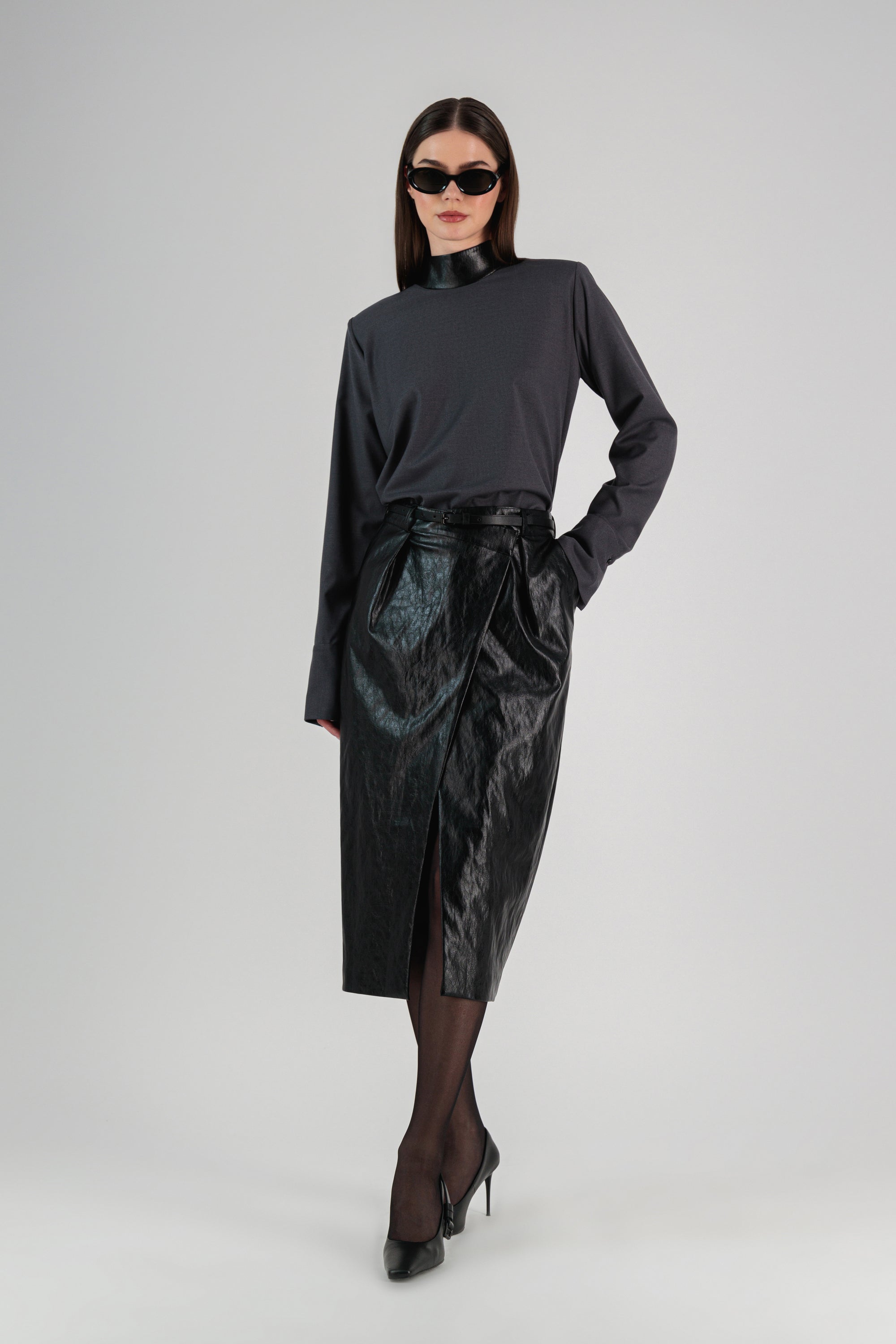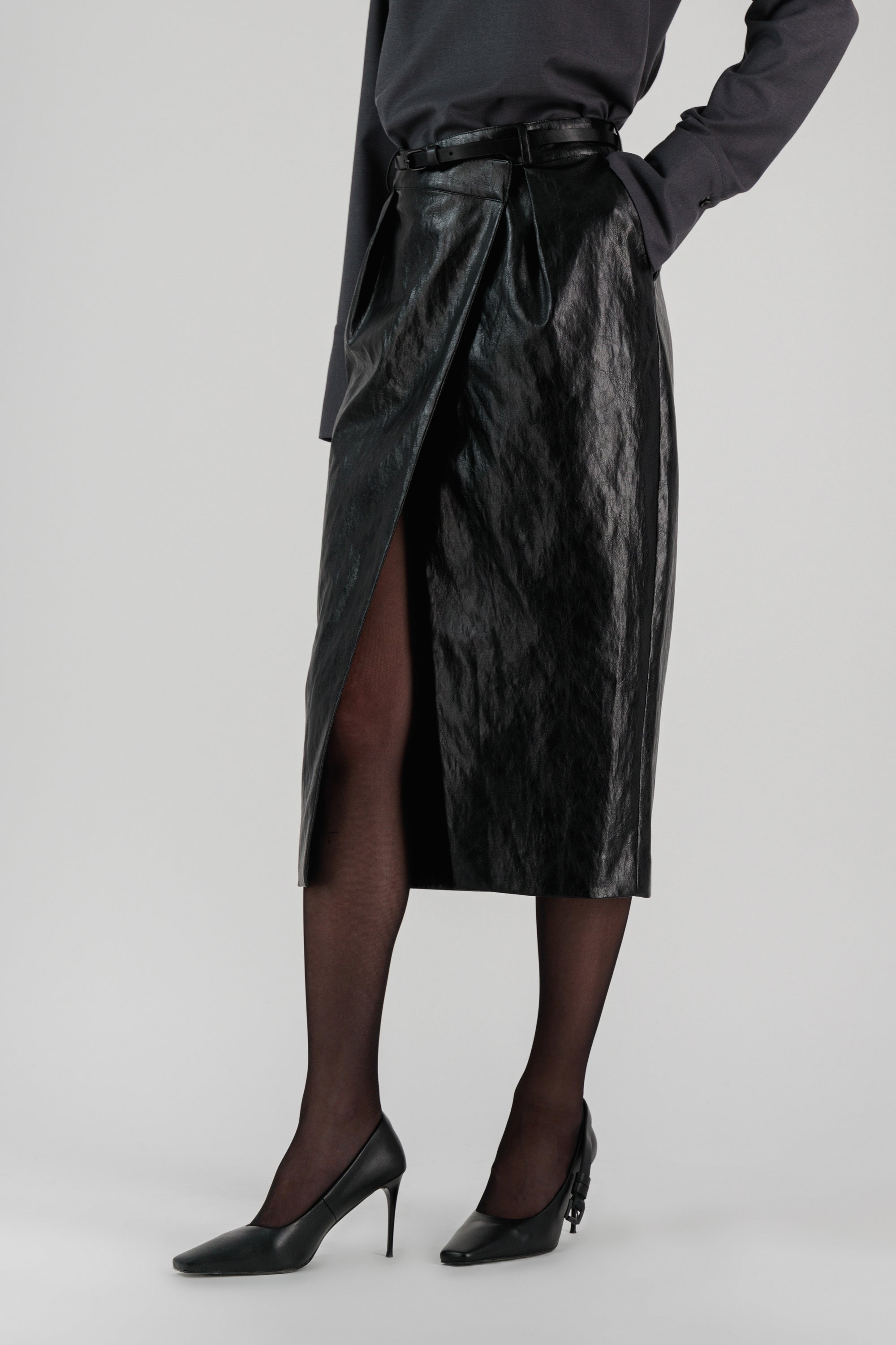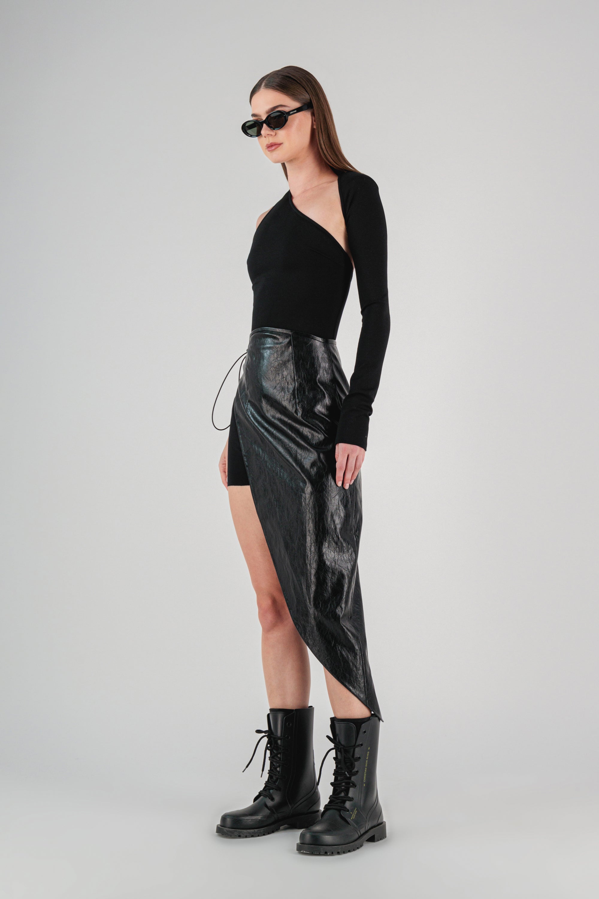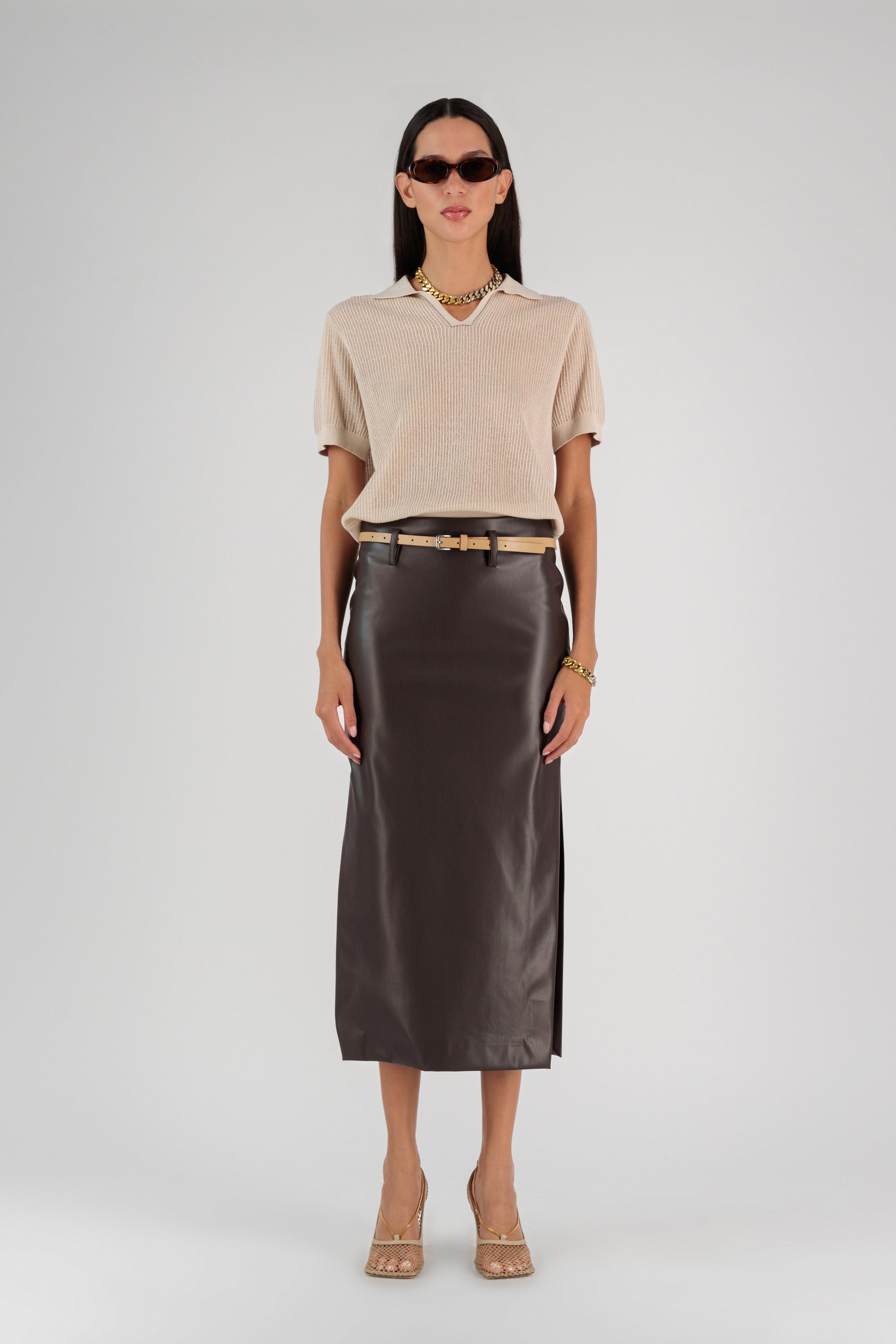 VEGAN LEATHER TWO SIDES SLIT MIDI SKIRT