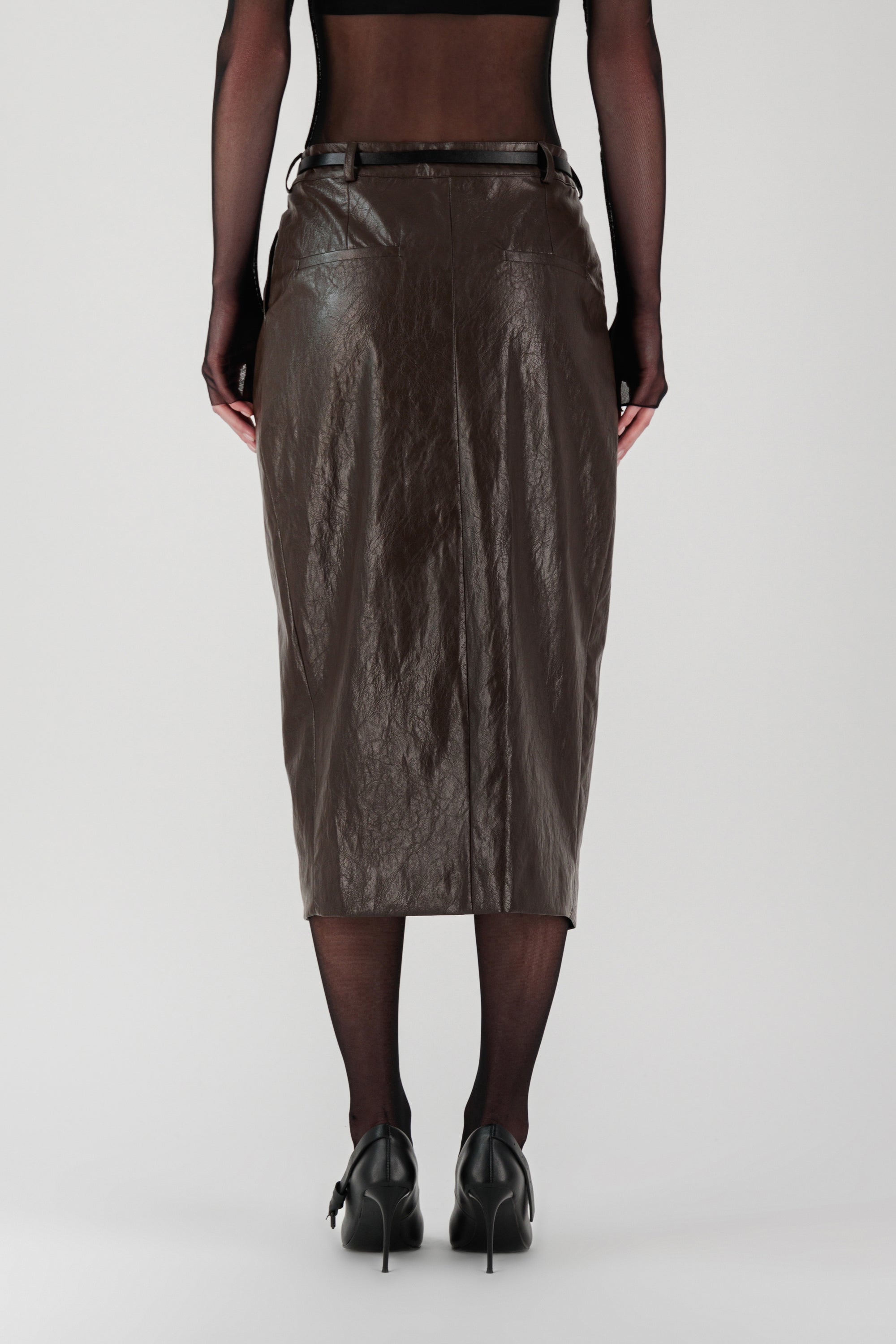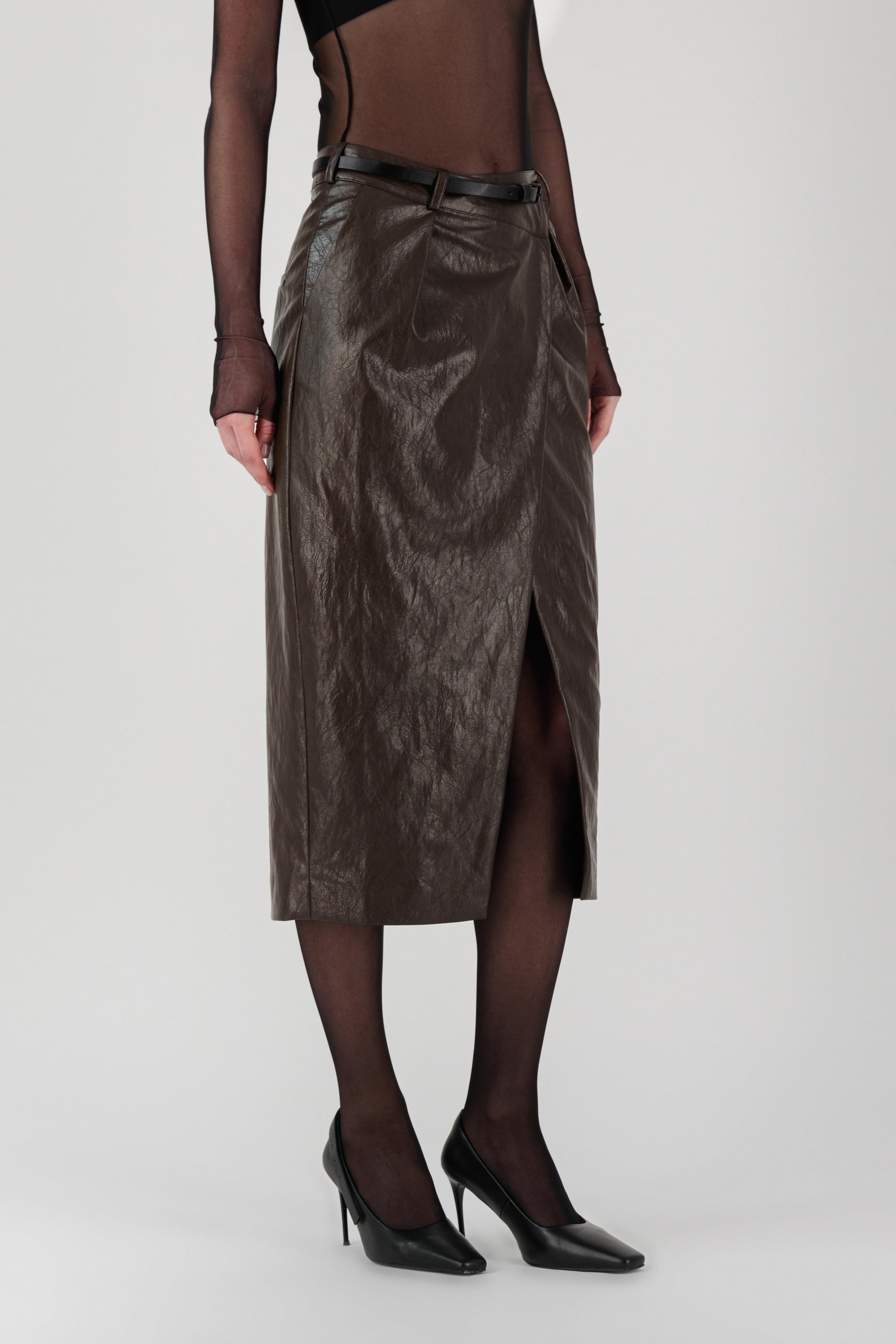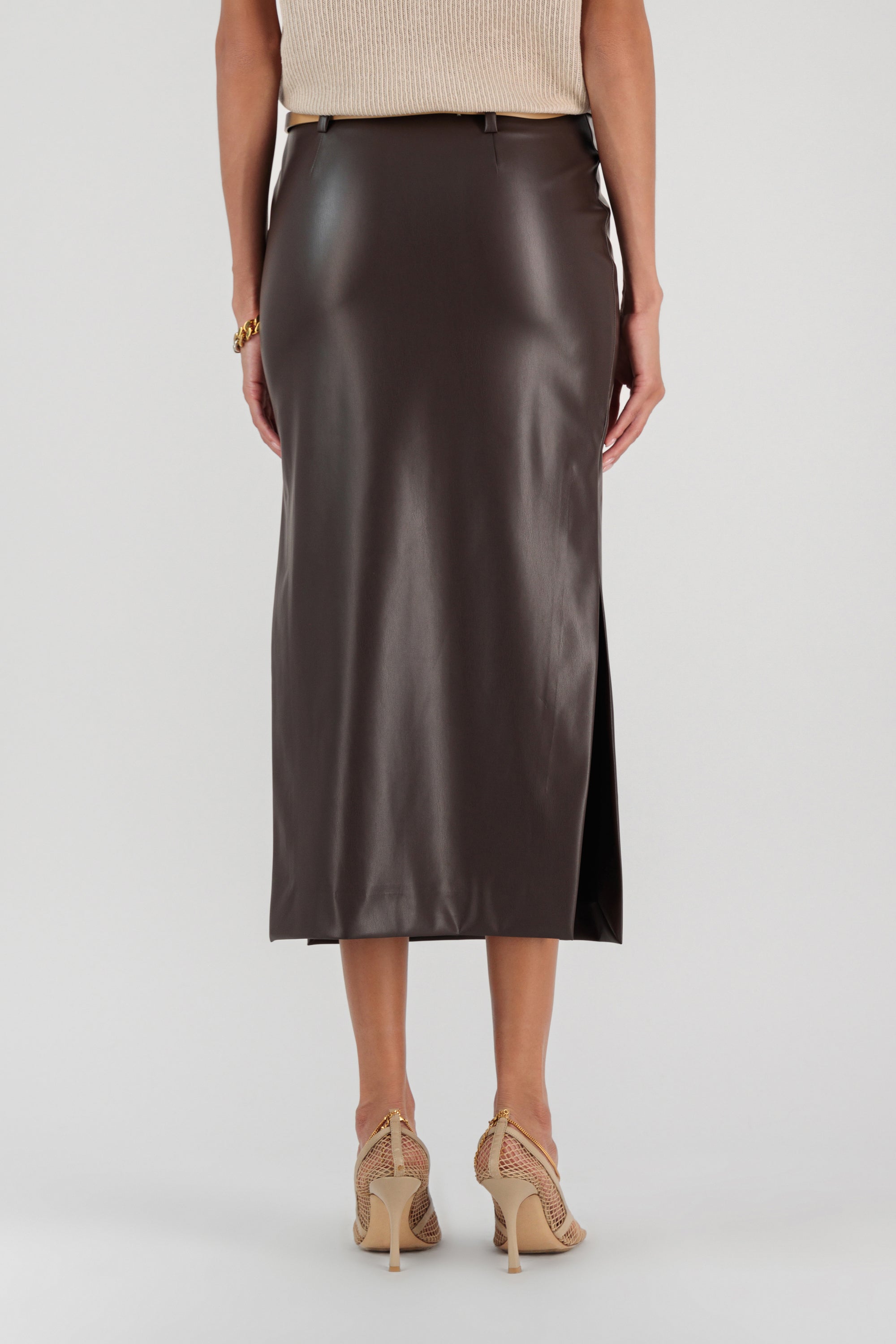 VEGAN LEATHER HIGH SLIT MIDI SKIRT