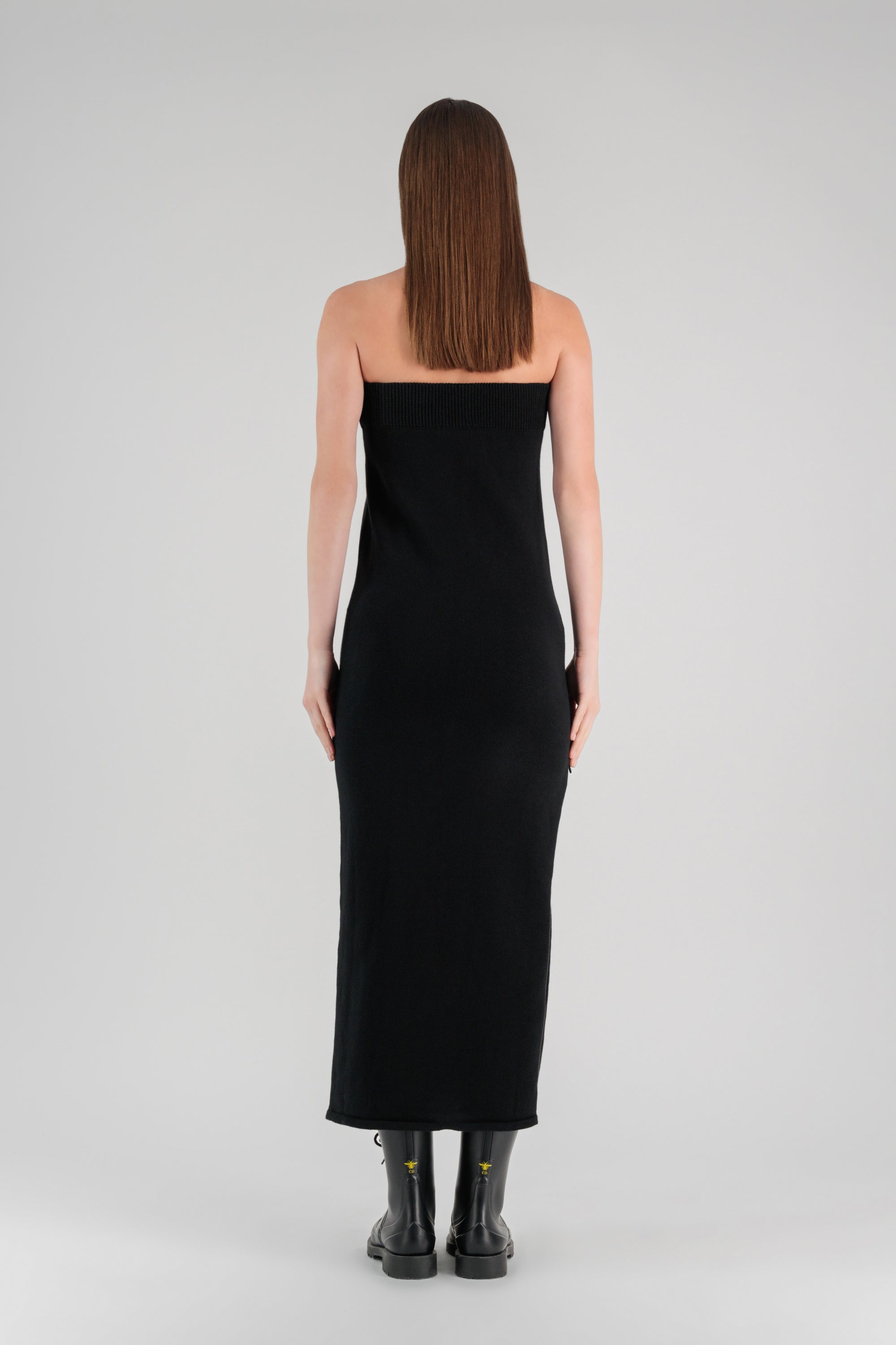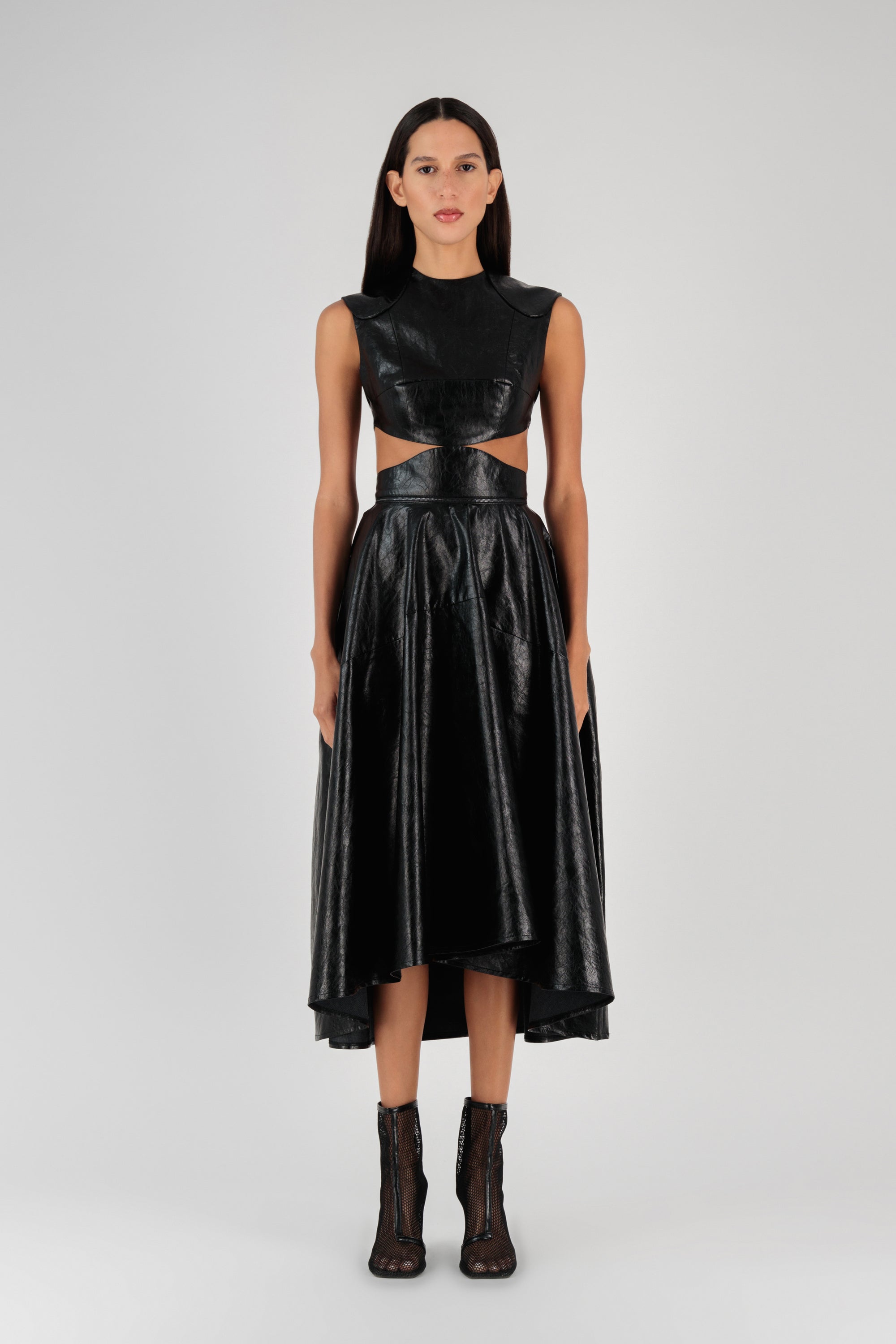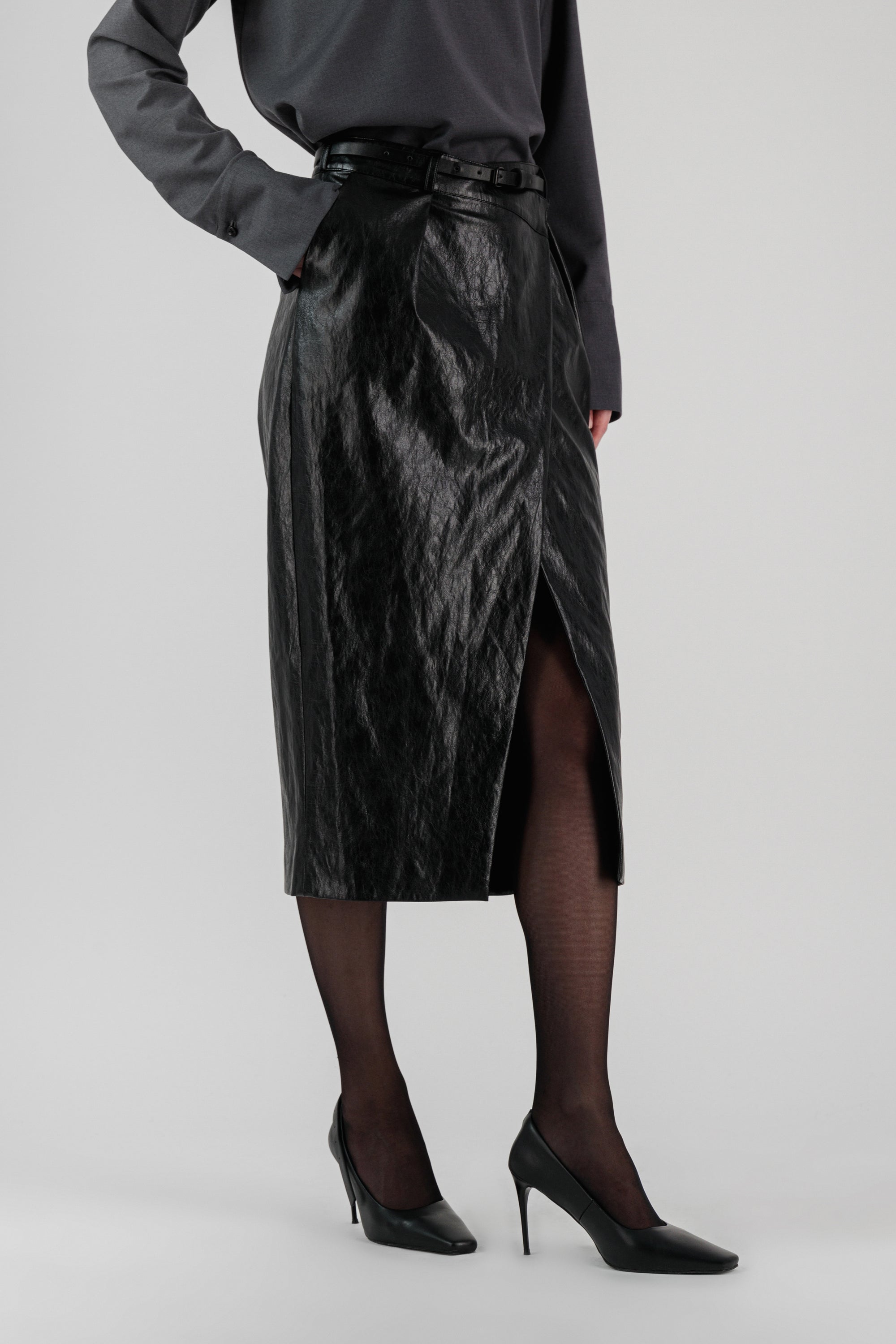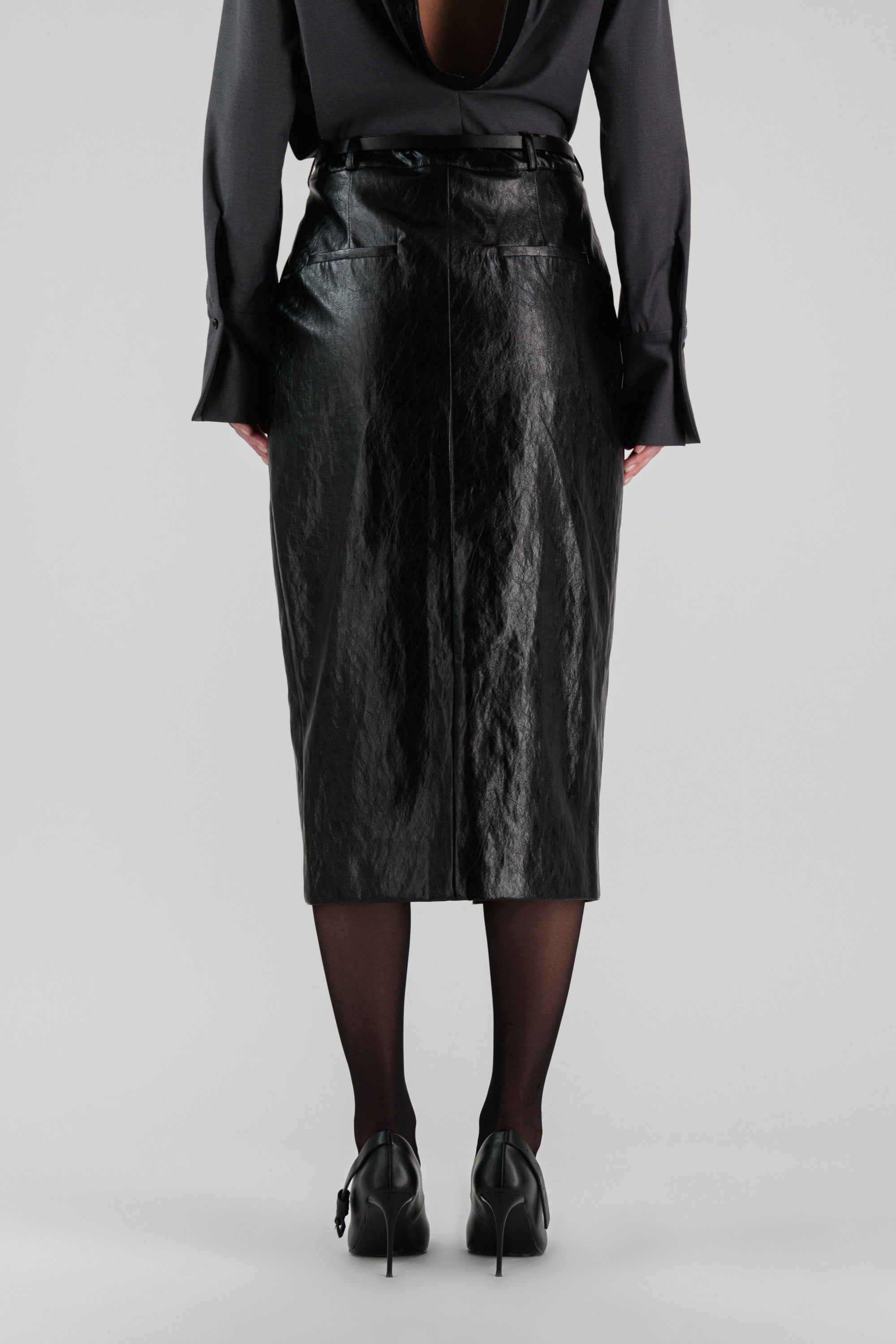 VEGAN LEATHER HIGH SLIT MIDI SKIRT